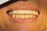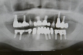 上の全ての歯がぐらぐらな状態で左上の歯(写真向かって右上)が痛いとご来院。入れ歯は絶対に嫌ということで、まずは痛む左上(レントゲンでは右上)を抜歯、サイナスリフト(骨の移植)を併用しインプラント埋入して残りの歯で無理やり仮歯を支える。左上インプラントが生着し左で咬めるようになったら前歯(鼻の下がくぼんで老人様顔貌を避けるため骨の厚みを出す手術併用)、右上の歯はすべて抜歯して(ソケットリフト併用)しインプラント埋入。生着に時間のかかる日本承認の従来型のインプラントだったので計1年以上の治療期間を要しましたが一度もご自身の歯で咬めない時期はないようにしました。